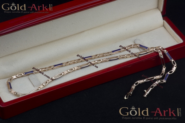 - Длинные звенья изысканно выделены горячей фиолетовой эмалью, что создает яркий контраст с блеском красного золота и придает цепочке роскошный и выразительный вид.